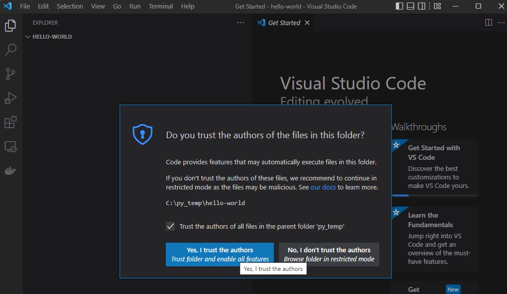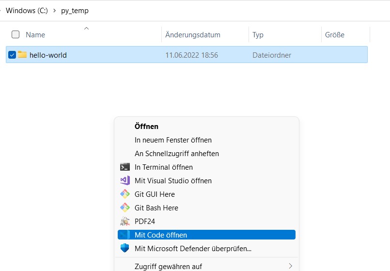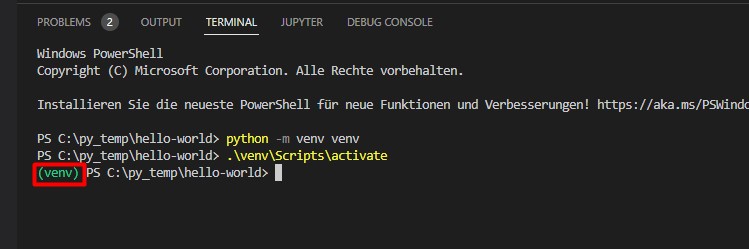 The following screenshots show you how you set up a sample Project with a Virtual Environment from scratch with VS Code in below one minute (maybe not if you’re doing it the first time …)