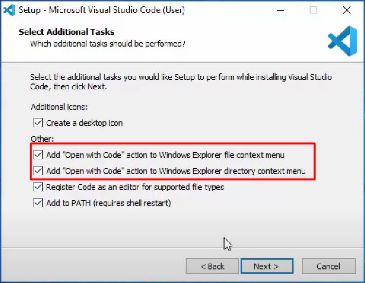 While installing you’ll be asked if you want to add “Open with Code” to your file and folder Explorer context menus (because you’re asking yourself: this is when you right click on something).